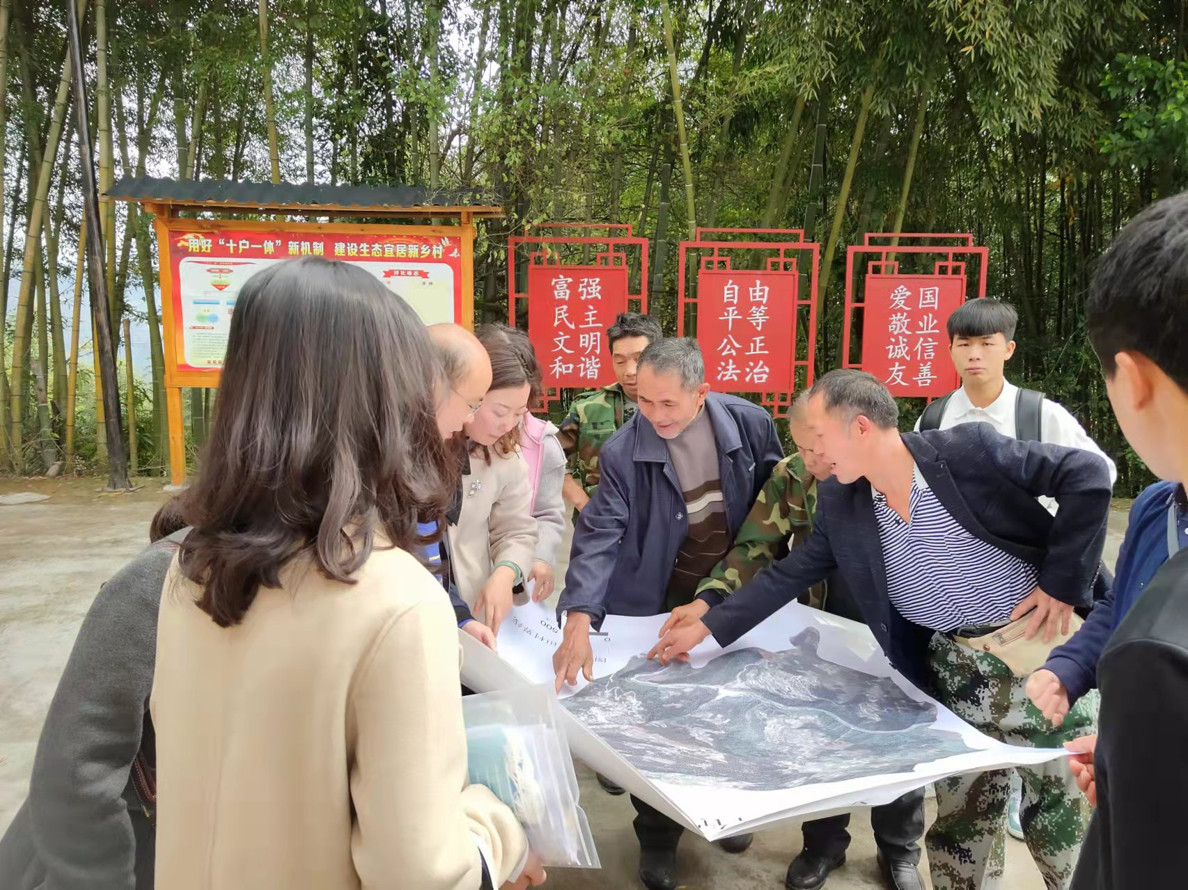 上午抵达大田村村委会后,土地资源管理专业的教师党员们立即与村委干部一起讨论卫星地面测绘遥感图,研究村落变迁及发展规划等,并提出了专业建议。