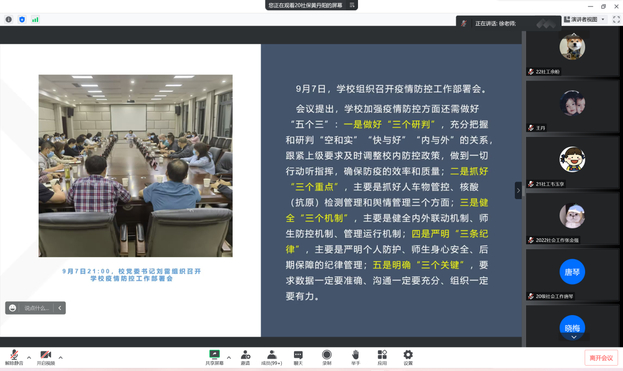 为充分发挥党支部战斗堡垒作用,鼓励号召广大党员力所能及地抗击疫情,手机赚钱 党委牵头组织开展了“同心战‘疫’ 我是防疫科普员”主题活动。9月23日,由研究生第二党支部进行第一期科普活动,为手机赚钱 学生讲解我校目前的疫情防控措施和规定。活动以线上主题党日活动的方式进行,由研究生第二党支部书记徐欣主讲,20、21和22级社会保障、社会工作和社会医学及卫生事业管理全体学生参与。