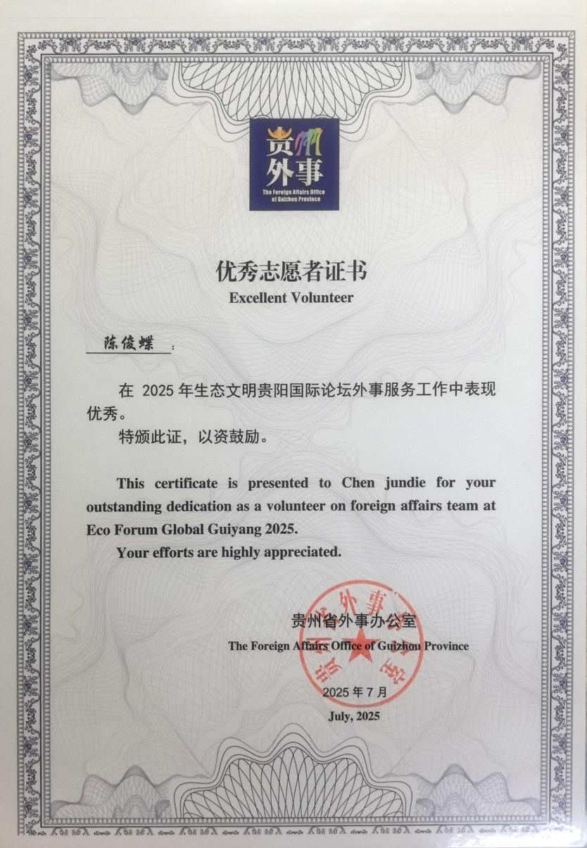 陈俊蝶:参加了由贵州省人民政府统筹举办的生态国际论坛志愿服务,以高度的责任感坚守岗位18天。服务期间,她始终保持饱满精神状态,每日早出晚归,往返于机场与高铁站之间,高效完成外国嘉宾迎接等重要任务,用实际行动生动诠释了奉献精神。凭借出色的服务表现,她在活动结束后荣获省级“优秀志愿者”表彰。