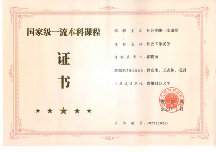 其中,《社会工作实务》获批国家级一流本科课程(社会实践类)、贵州省级“金课”(社会实践一流课程)。《社会管理》获批贵州省级“金课”(虚拟仿真实验教学课程)。