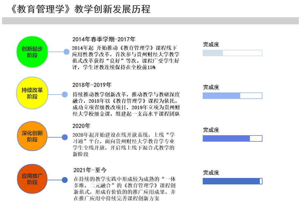 课程团队自2014年启动教学改革,形成清晰的发展脉络:2014—2017年为“创新起步阶段”,首次参与贵州财经大学教学范式改革并获“良好”等次,学生评教位居全校前15%;2018—2019年为“持续改革阶段”,推动教学与教研深度融合,2018年依托课程立项省级教改项目,2019年成功获批贵州财经大学校级金课;2020年为“深化创新阶段”,建设在线开放课程并上线“学习通”平台,开启“线上线下混合式教学”新模式;2021年至今为“应用推广阶段”,形成成熟的“一体多维,二元融合”课程创新范式,建成《教育管理学》SPOC(小规模限制性在线课程)并在超星平台稳定运行,实现教学模式的系统化升级。