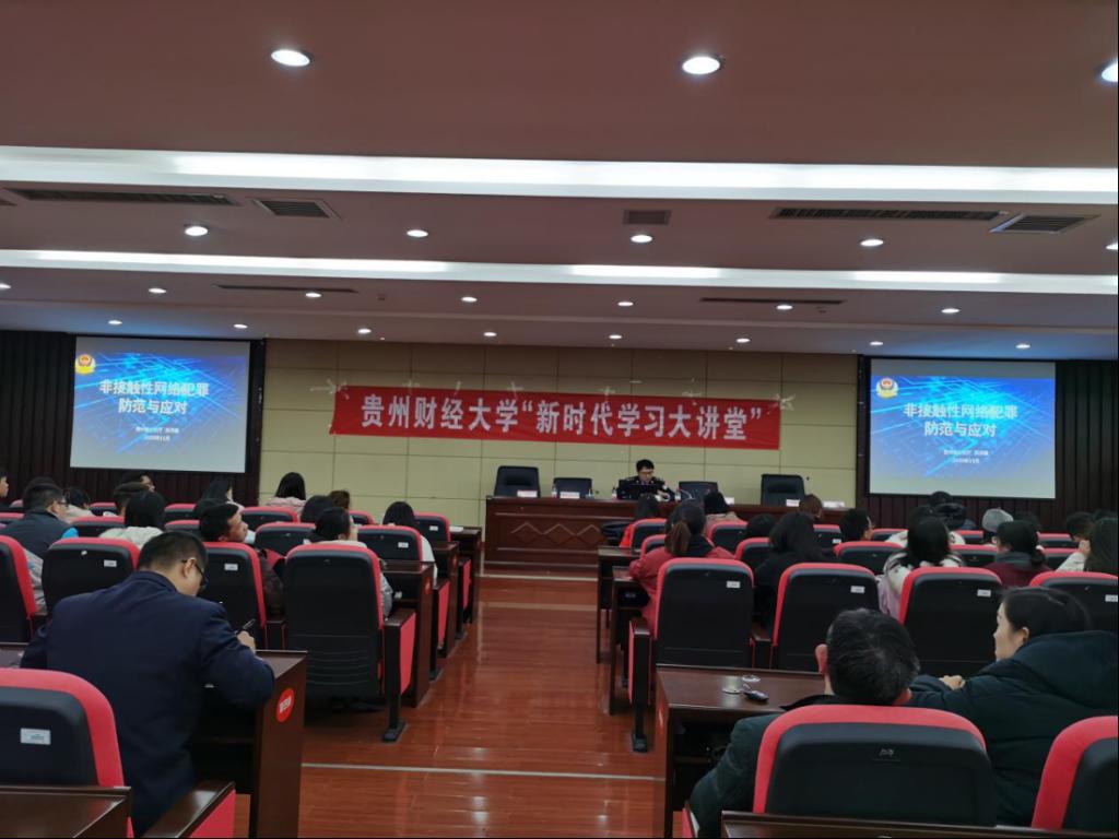 讲座中,张泽鑫围绕非接触性网络犯罪防范和应对,介绍了几个关于非接触性网络犯罪的实例,并提出如何做到防范和应对,随后,根据电信诈骗典型案例以及套路贷典型案例,介绍了冒充假警察、购车退税、网购风险、积分补差价、航班取消情况,以及中奖电话等等案例,提醒广大师生要提高警惕和防范,不要轻易借钱,不要过度消费。最后,张泽鑫介绍了贵州贵安110,并提醒大家在遇到网络诈骗时,要及时报警。
