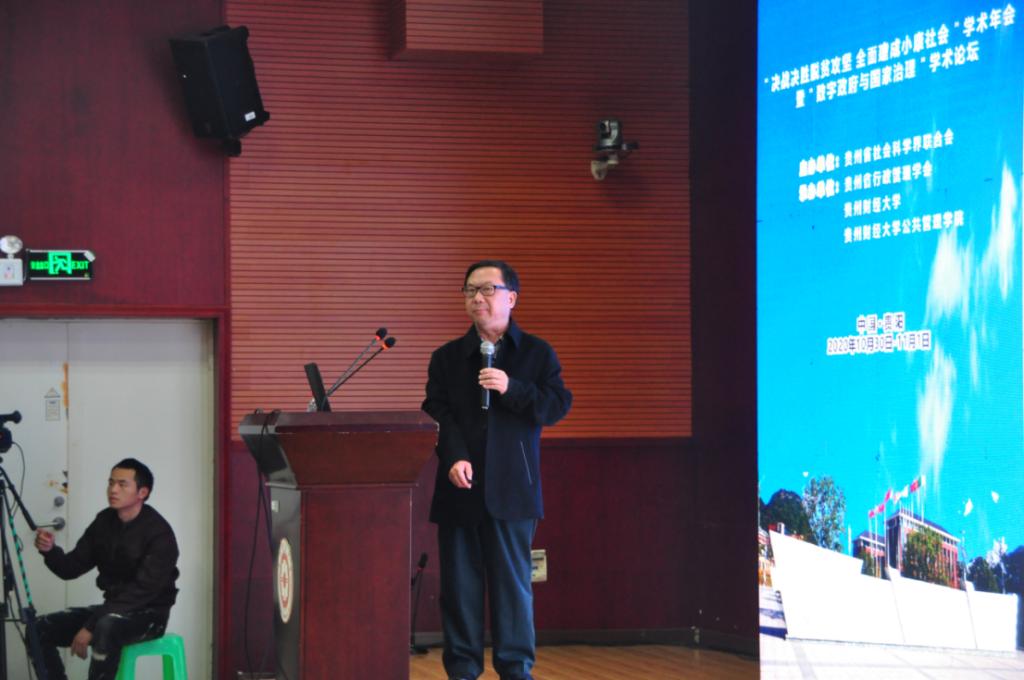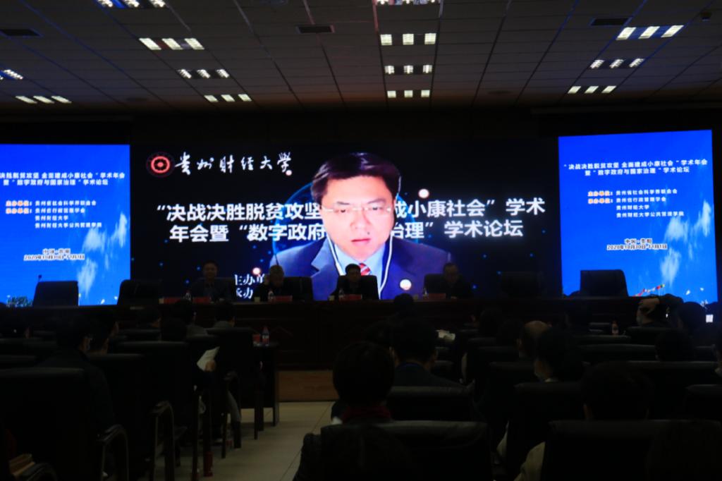 为实现决战决胜脱贫攻坚,全面建成小康社会的目标,进一步推进数字政府治理,提高国家治理能力,2020年10与31日-11月1日,由贵州省社会科学界联合会主办,贵州省行政管理学会、贵州财经大学、手机赚钱 联合承办的贵州省社科界“决战决胜脱贫攻坚 全面建成小康社会”学术年会暨 “数字政府与国家治理”学术论坛,在贵州财经大学花溪校区举行。贵州财经大学校长赵普,公共管理专业学位研究生教学指导委员会秘书长、中国人民大学手机赚钱 院长杨开峰教授,新华文摘编审胡元梓,公共管理专业学位研究生教学指导委员会委员徐晓林教授代表出席开幕式,开幕式由贵州财经大学党委副书记杨勇主持。共有来自清华大学、中山大学、厦门大学、华中科技大学、大连理工大学、云南大学等全国各高校、党校、实践部门180余名专家学者、研究生通过线上线下形式参与此次会议。