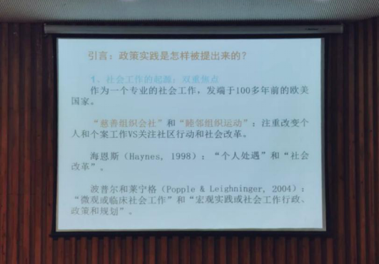 陈树强教授就社会工作的起源、发展过程中的两重焦点(一是注重改变个人的微观层面,二是研究社区行动的宏观层面)引出“政策实践”概念。社会工作起源于贫民救济或慈善事业,是伴随工业化引发的社会问题而产生的,可以说,工业化先行国家通过社会工作实践解决社会问题的理念和方法为政策实践的产生奠定了理论基础。直到西方学者在上世纪80年代认识到,社会工作对改变个人的过分强调,已经严重偏离了社会工作的专业使命,由此他们提出政策实践的概念,以平衡社会工作的这两个焦点。