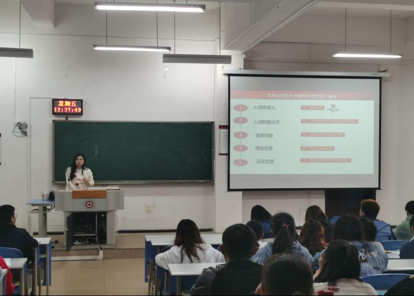 本次党课培训,王倩倩首先强调了写入党申请书及入党常用文格式正确的重要性,分别详细地介绍了写入党申请书和思想汇报的正确格式及其需要重点注意的地方。其次,王倩倩详细地叙述了入党的五个阶段及其二十五个流程。最后,王倩倩重点强调入党积分子们务必记住写入党申请书、成为入党积极分子、成为发展对象、成为预备党员的时间。