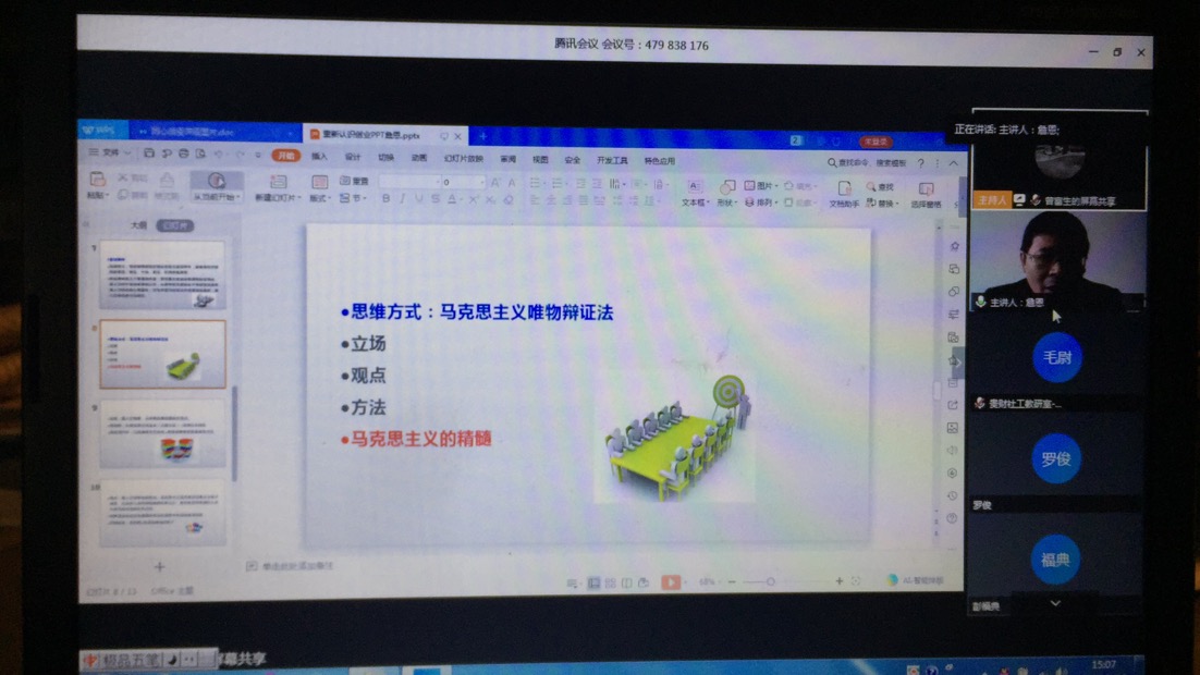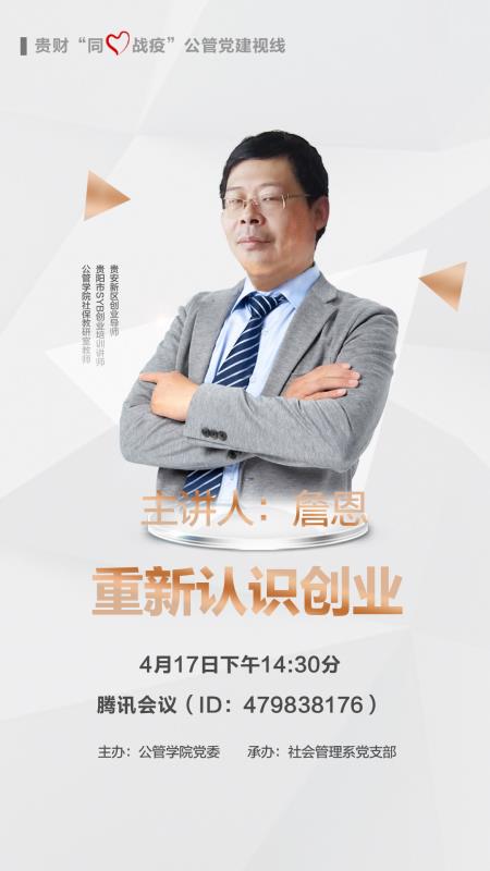 4月17日,由手机赚钱 党委主办贵财“同心战疫”公管党建视线系列专题讲座正式上线,第一期讲座由社会管理系党支部承办,由贵安新区创业导师、贵阳市SYB创业培训讲师、手机赚钱 社保教研室党员教师詹恩主讲《重新认识创业》,手机赚钱 各专业师生160余人通过腾讯会议APP同步参加,讲座由社会管理系主任(兼任系党支部书记)曾富生教授主持。