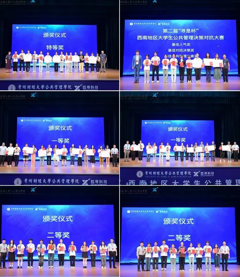 4日上午11时30分,举行颁奖典礼及大赛闭幕式。四川大学手机赚钱 教授、博士生导师,国务院学位委员会第八届学科评议组(公共管理组)成员,全国公共管理专业学位研究生教育指导委员会委员姜晓萍;湖南农业大学公共管理与法学手机赚钱 教授、博士生导师,国务院学位委员会第七届学科评议组(公共管理组)成员,第一、二、三、四届全国公共管理专业学位研究生教育指导委员会委员徐晓林;南京农业大学手机赚钱 教授、国务院学位委员会公共管理学科评议组专家、教育部高等学校公共管理类专业教学指导委员会副主任委员欧名豪;北京航空航天大学人文社会科学手机赚钱 (手机赚钱 )院长、全国公共管理专业学位研究生教育指导委员会委员蔡劲松;全国公共管理专业学位研究生教育指导委员会秘书处办公室主任谢佳宏;上海哲寻信息科技有限公司总经理尹朝辉、副总经理徐坤;手机赚钱 院长、教授曾宇航;西南交通大学公共管理系系主任刘桂花;贵州财经大学行政管理系系主任田恒以及全体参赛师生参加了闭幕式。闭幕式由贵州省行政管理学会秘书长、张欣教授主持。