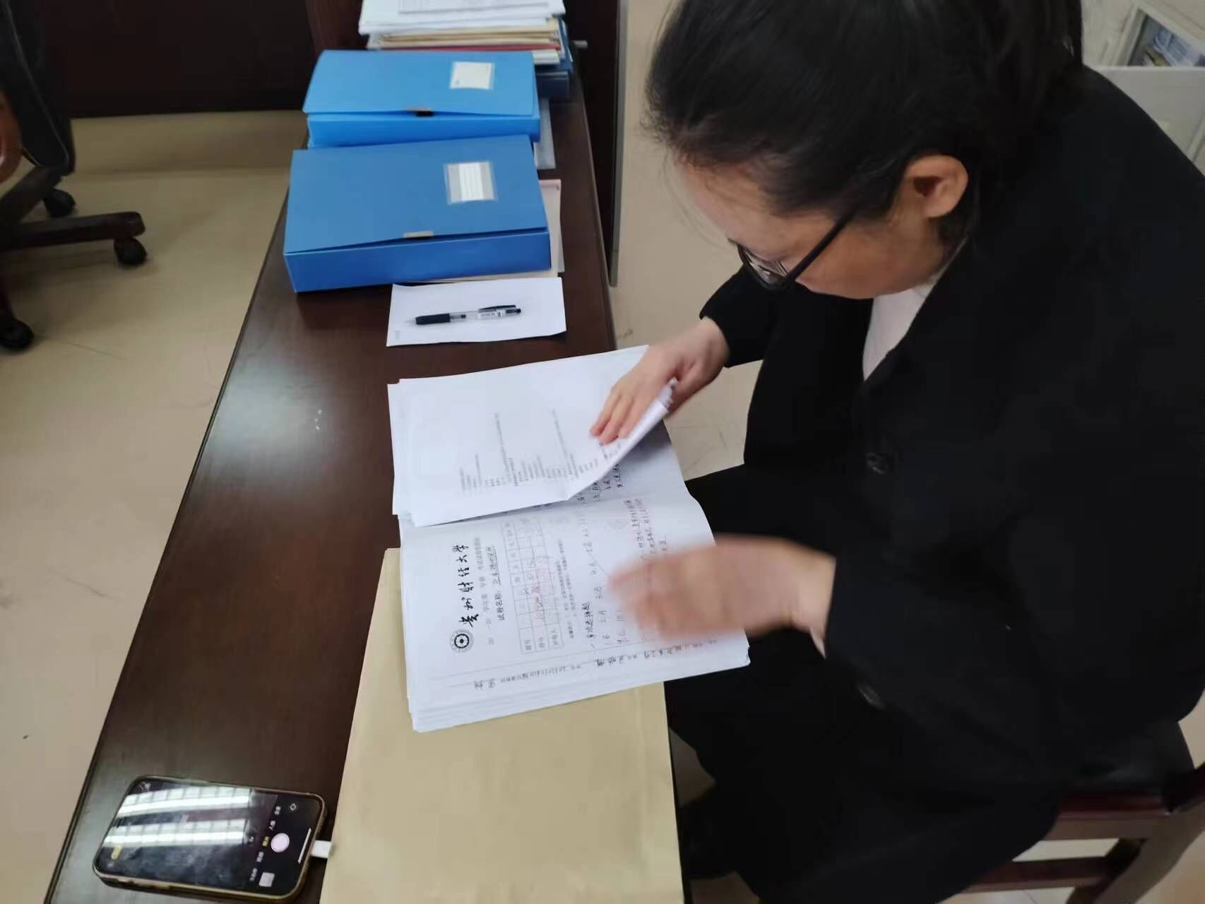本网讯:(姜丽 报道|摄影 周梅)为进一步加强学校教学质量建设,根据学校教学管理工作总体安排部署,按照高评函〔2023〕14号函件的要求,手机赚钱 成立了专项自查小组对2022-2023学年各年级学生考试试卷、毕业论文、课程教学大纲、教材使用情况等教学“四项”进行了自查。
