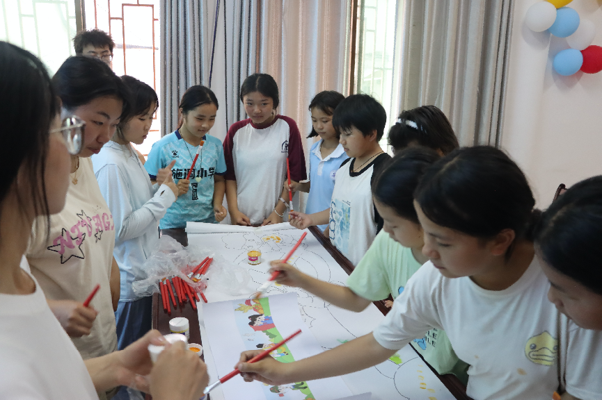 在“共绘中国梦”活动中,三下乡实践队员与当地儿童一起进行现场创作,把自己对祖国对热爱,通过集体绘画的形式展示出来。