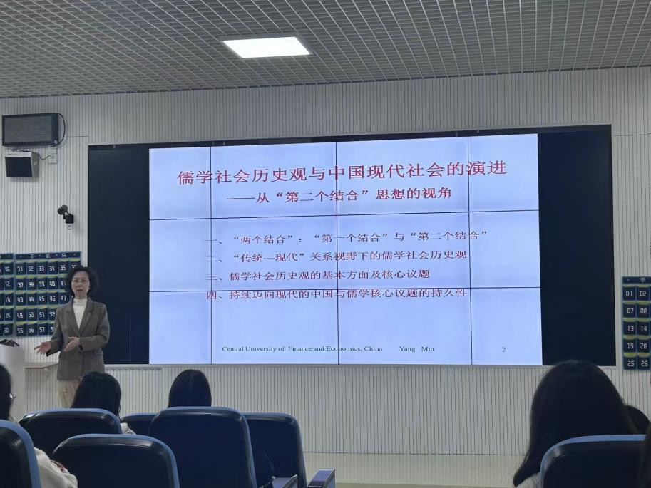 杨教授进一步结合土地产权公有制确立、乡村振兴等重大制度实践,阐释了传统“治乱”循环如何在新时代被创造性超越。她通过古今中外对照,生动展现了“第二个结合”如何使古老智慧焕发现代生机,令师生对儒学思想的当代价值与实践意义有了更系统、深刻的认识。