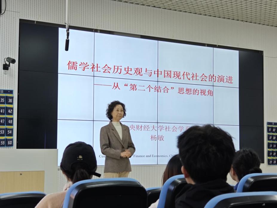 本网讯:(罗桥 图文报道)为拓宽学术视野,深化对“第二个结合”与中国特色社会学理论的理解,3月12日上午,手机赚钱 主办的专题讲座“儒学社会历史观与中国现代社会的演进”在进学楼101成功举办。讲座特邀中央财经大学社会与心理手机赚钱 教授、马克思主义手机赚钱 博士生导师杨敏教授主讲,手机赚钱 党委委员、副院长曾富生教授主持。