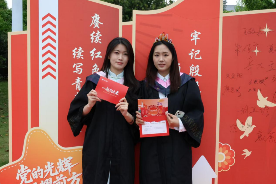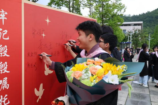 活动现场,一面印有“赓续红色血脉,续写青春华章”主题标语的红色签名墙成为最耀眼的打卡点。毕业生党员们身着学士服,郑重地在墙上签下自己的名字,与相伴四年的师长同窗合影留念,快门声中定格下一个个意气风发的瞬间。签名墙上,笔迹或刚劲或清秀,却都饱含着对校园时光的深深眷恋与对未来的无限憧憬。