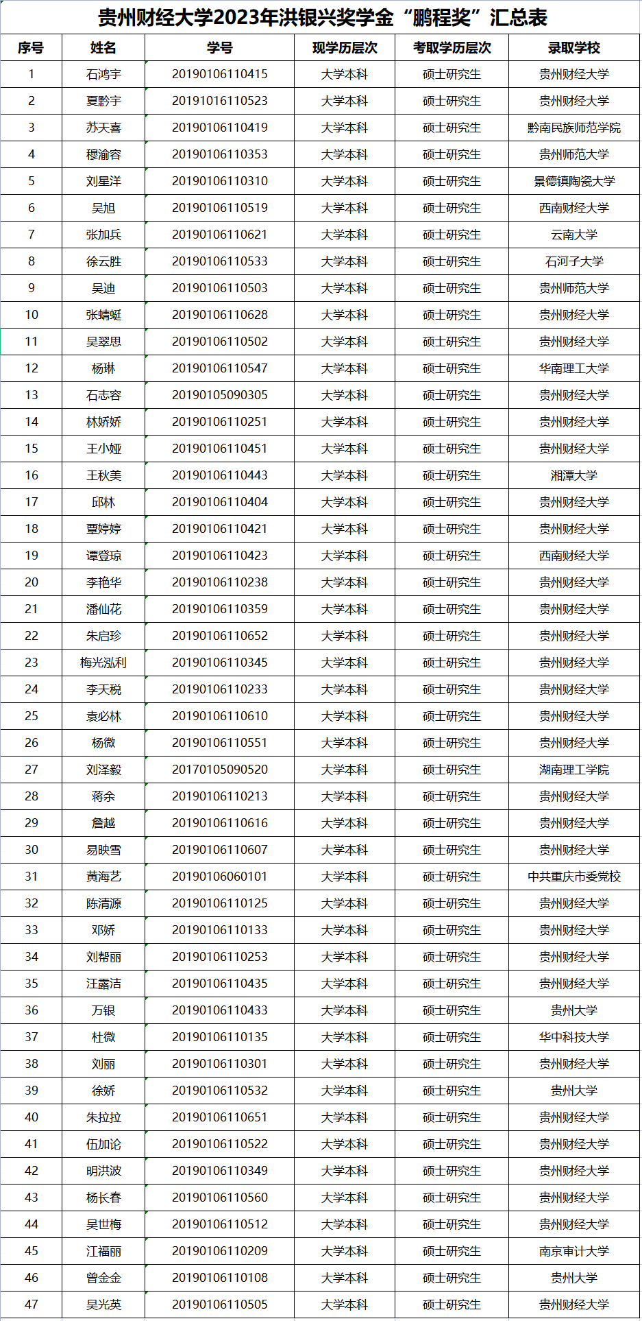 根据《贵州财经大学“洪银兴奖学金”实施管理办法(修订)》 (校办发〔2021〕125 号)文件精神。经手机赚钱 党政联席会议研究决定,现拟定以下同学参评2023年洪银兴奖学金“鹏程奖”。