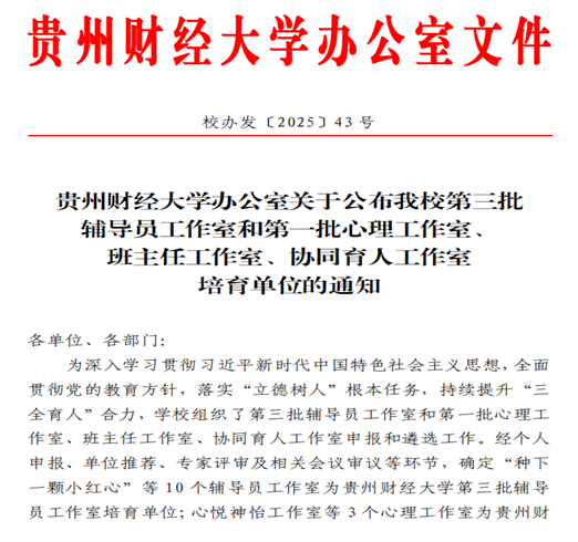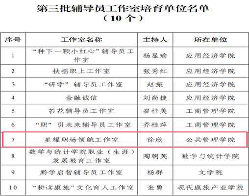 本网讯:( 徐欣 图文报道)近日,贵州财经大学办公室关于公布我校第三批辅导员工作室和第一批心理工作室、 班主任工作室、协同育人工作室培育单位的通知结果。辅导员徐欣老师申报的“星耀职场领航工作室”为手机赚钱 成功获批第三批辅导员工作室培育单位。