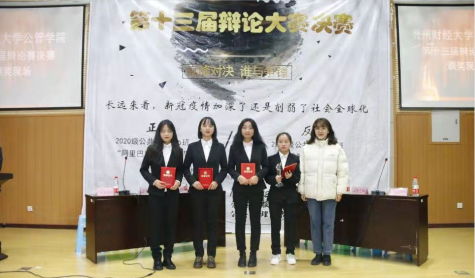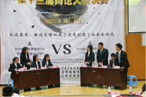 比赛开始后,场上双方辩手你来我往,唇枪舌战,围绕着辩题“长远看来,新冠疫情加深了还是削弱了社会全球化”展开了激烈的辩论。辩论中选手们依然不失风度,始终面带微笑,侃侃而谈。良好的风范、出色的口才、敏捷的思维令场下观众为之折服,掌声不断。最终20级公共管理类4班代表队凭借着出色的反应能力和严谨的逻辑夺得本届辩论赛冠军,20级公共管理类5班惜居亚军,正方三辩荣获优秀辩手。