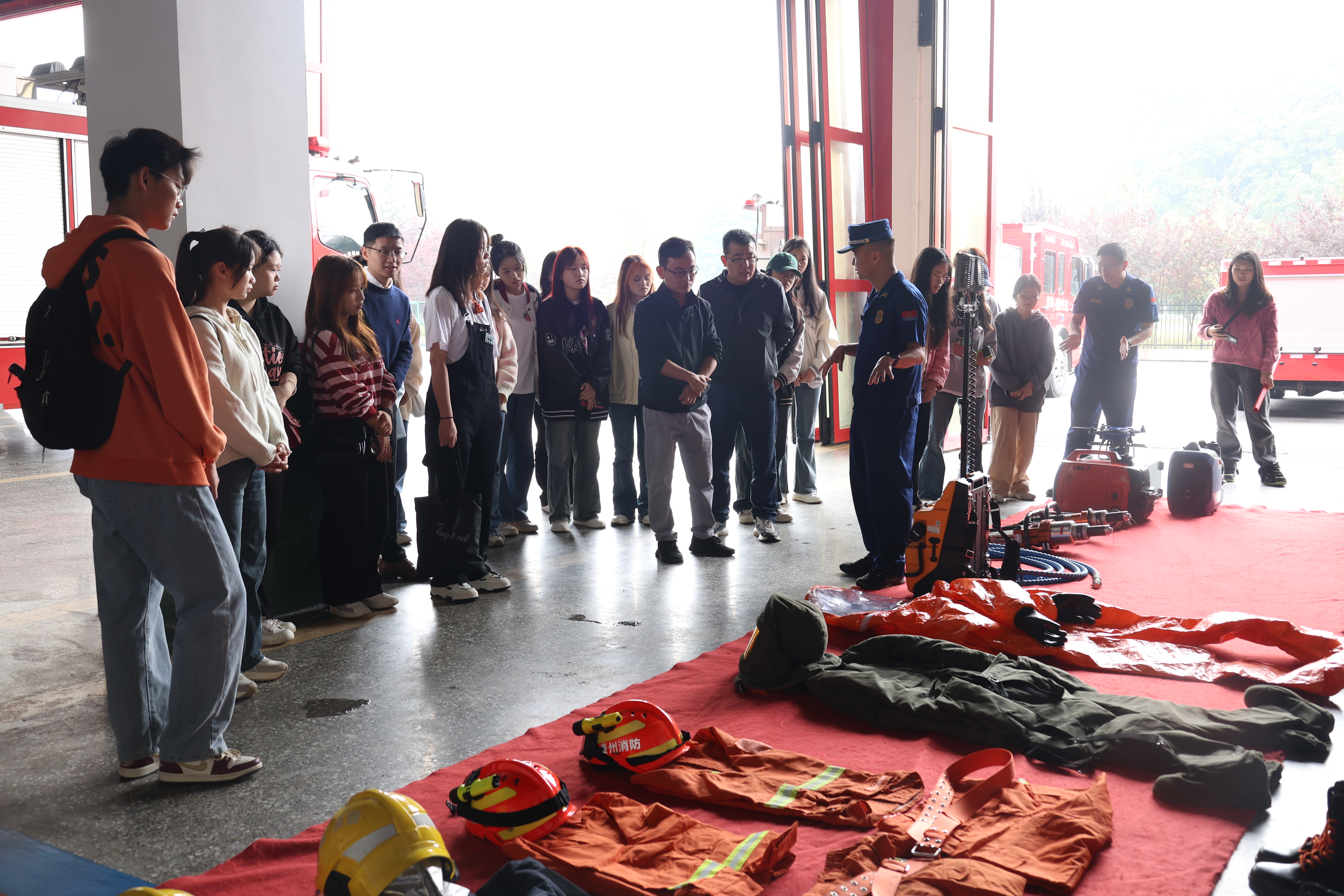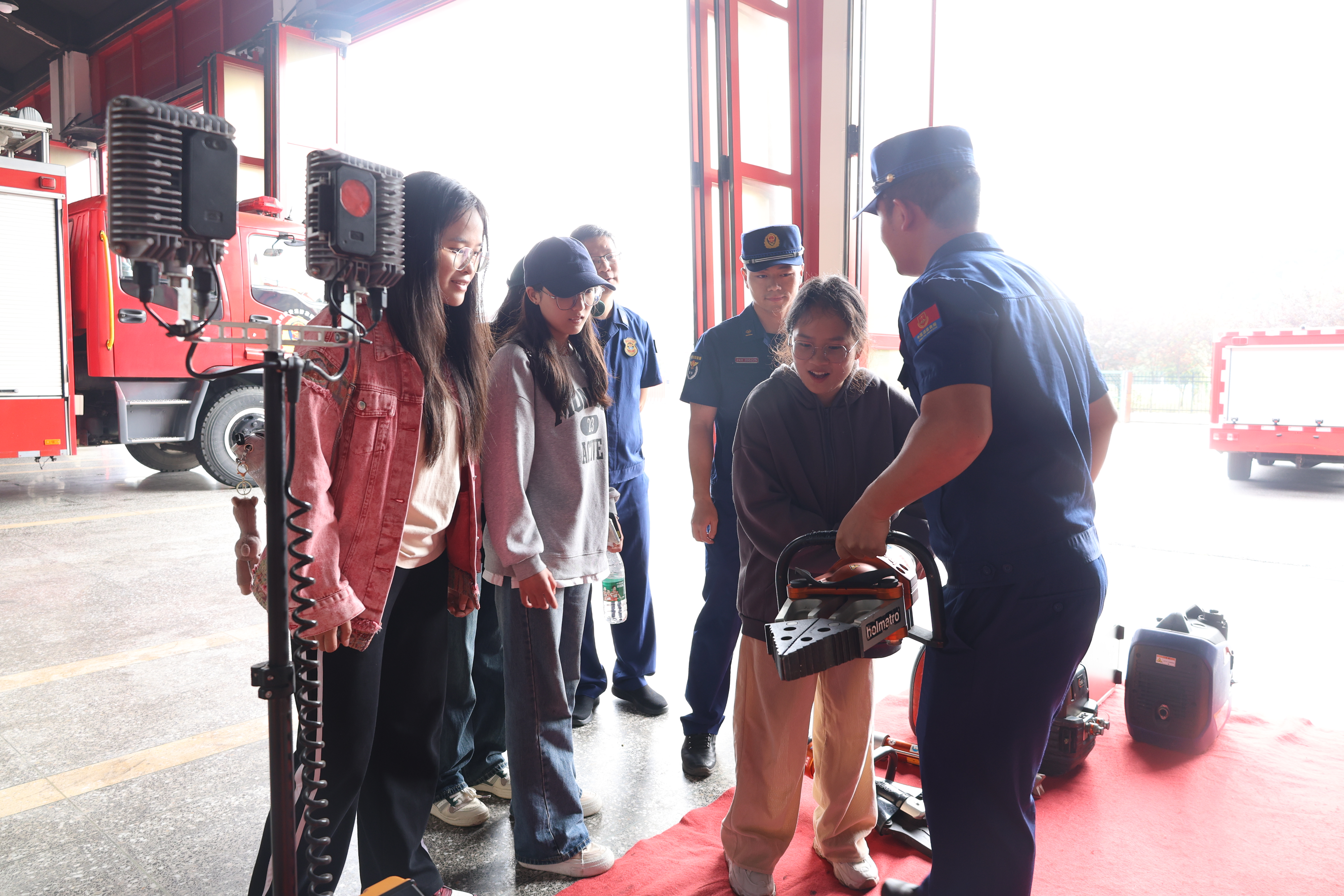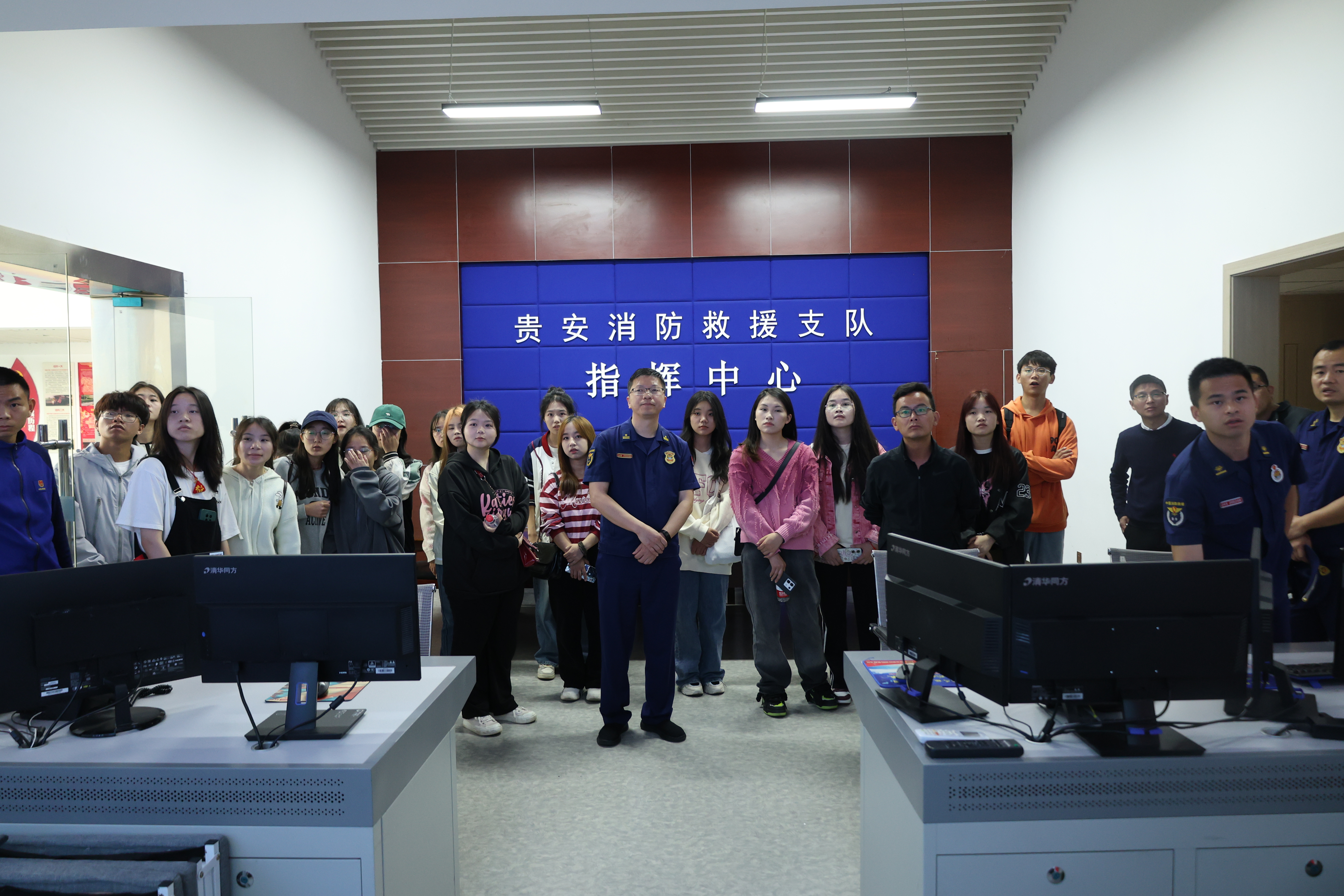贵安新区消防救援支队副政委、纪委书记谭冲对来访师生表示欢迎。随后,在队务督察科科长刘洪镔的带领下,师生们深度参观了消防救援车辆、救援设施、特勤装备等消防设施,并亲身体验了消防服穿戴、油池干粉灭火等活动。