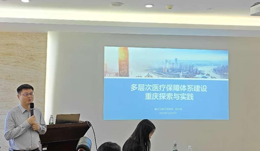 课题汇报之后,会议围绕多层次医疗保障体系建设进入研讨会阶段。首先由重庆市医疗保障局待遇保障处处长田小刚进行了多层次医疗体系构建的经验交流。田小刚处长对重庆多层次医疗保障体系进行了介绍,并详细介绍了重庆普惠性商业健康保险“渝快保”的发展历程、运行现状和减负效果,分享了“渝快保”的成果经验。