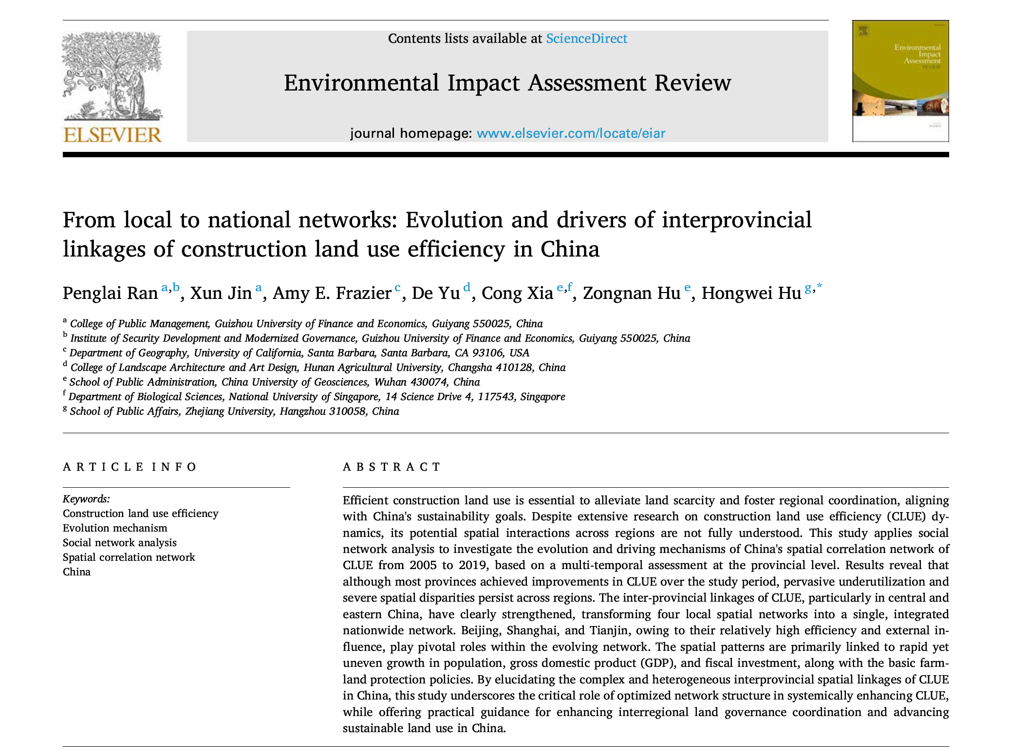 本网讯:(涂静美 图文报道)近日,环境科学领域重要期刊Environmental Impact Assessment Review刊发手机赚钱 土地资源管理专业教师冉澎铼及其硕士研究生金训的学术论文From local to national networks: Evolution and drivers of interprovincial linkages of construction land use efficiency in China。该期刊是爱思唯尔集团(Elsevier)出版的同行评审期刊,创建于1980年,聚焦环境影响评估与管理领域的跨学科研究,2025年位列中科院一区Top,SSCI Q1,影响因子11.2,在环境研究领域排名7th/193。