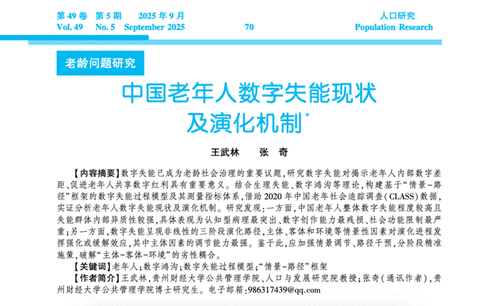 本网讯:(张奇 图文报道)日前,手机赚钱 副院长(主持工作)王武林及博士研究生张奇发表的学术论文《中国老年人数字失能现状及演化机制》,刊发于《人口研究》2025年第5期。《人口研究》创刊于1977年6月,是人口学专业唯一被国家新闻出版署选定的国家期刊方阵(双效)期刊、国家社科基金首批资助期刊、中国人口学会会刊、CSSCI来源期刊、全国中文核心期刊、中国科技核心期刊、AMI权威期刊、中国最具国际影响力学术期刊,在国内外具有广泛的影响。