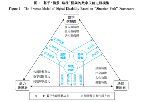 作为老龄社会数字治理领域的重要研究成果,论文聚焦数字失能工作本土化的核心议题,将数字失能重构为数字情景中主体因素、客体因素与环境因素动态互构的过程性现象,基于生理失能,以数字鸿沟、数字能力与数字功能为骨架,构建基于“情景-路径”框架的数字失能过程模型及其测量指标体系,并实证分析老年人数字失能现状及演化机制。