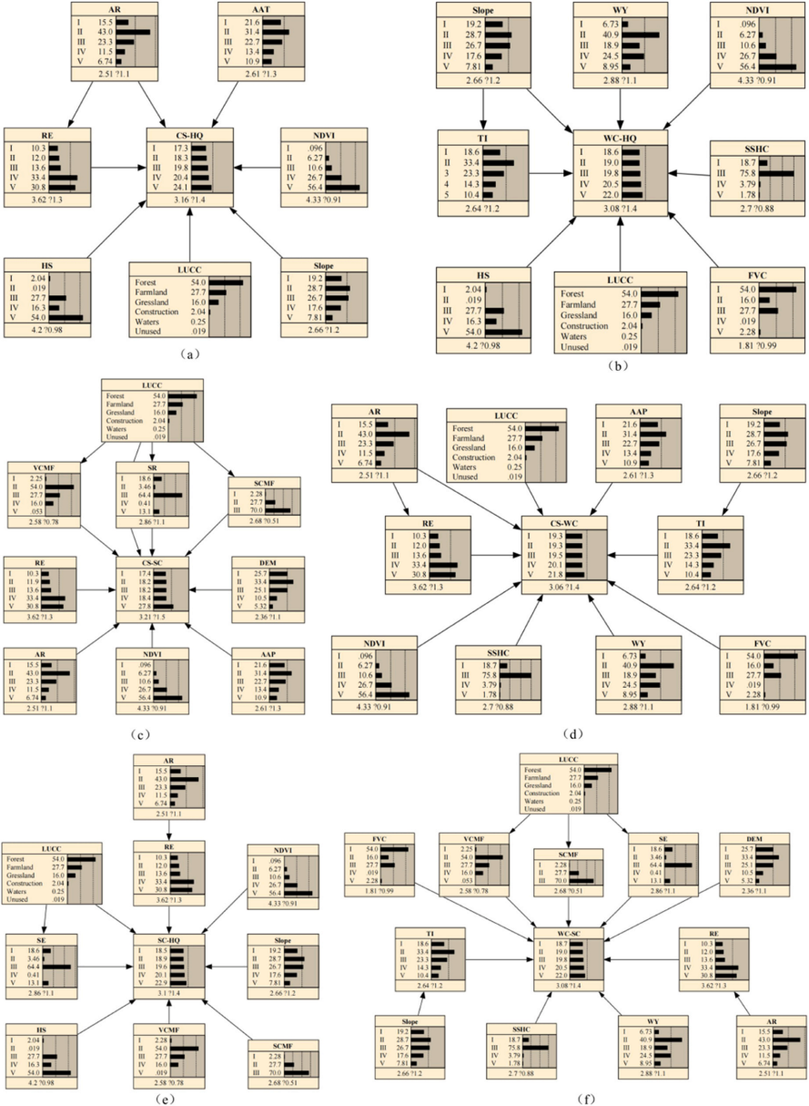 Fig. 6. Weighing collaborative relationship strength Bayesian network: (a) carbon storage and habitat quality (CS-HQ); (b) water conservation and habitat quality (WC-HQ); (c) carbon storage and soil conservation (CS-SC); (d) carbon storage and water conservation (CS-WC); (e) soil conservation and habitat quality (SC-HQ); (f) water conservation and soil conservation (WC-SC). AR: Annual rainfall; AAT: Average annual temperature; RE: Rainfall erosivity; NDVI: Normalized difference vegetation index; HS: Habitat suitability; LUCC: Land use type; WY: Water yield; TI: Topographic index; SSHC: Soil saturated hydraulic conductivity; FVC: Flow velocity coefficient; VCMF: Vegetation cover and management factor; SR: Soil erosivity; SCMF: Soil conservation measure factor; DEM: Digital elevation model.