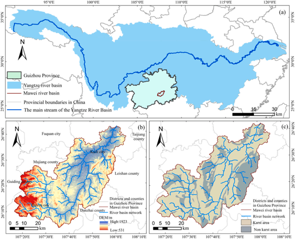 Fig. 1.Location of the study area:(a) Guizhou Province and the Mawei River Basin in the Yangtze River Basin; (b) Digital elevation model map of the Mawei River Basin in Guizhou Province; (c) Karst landscape of the Mawei River Basin.