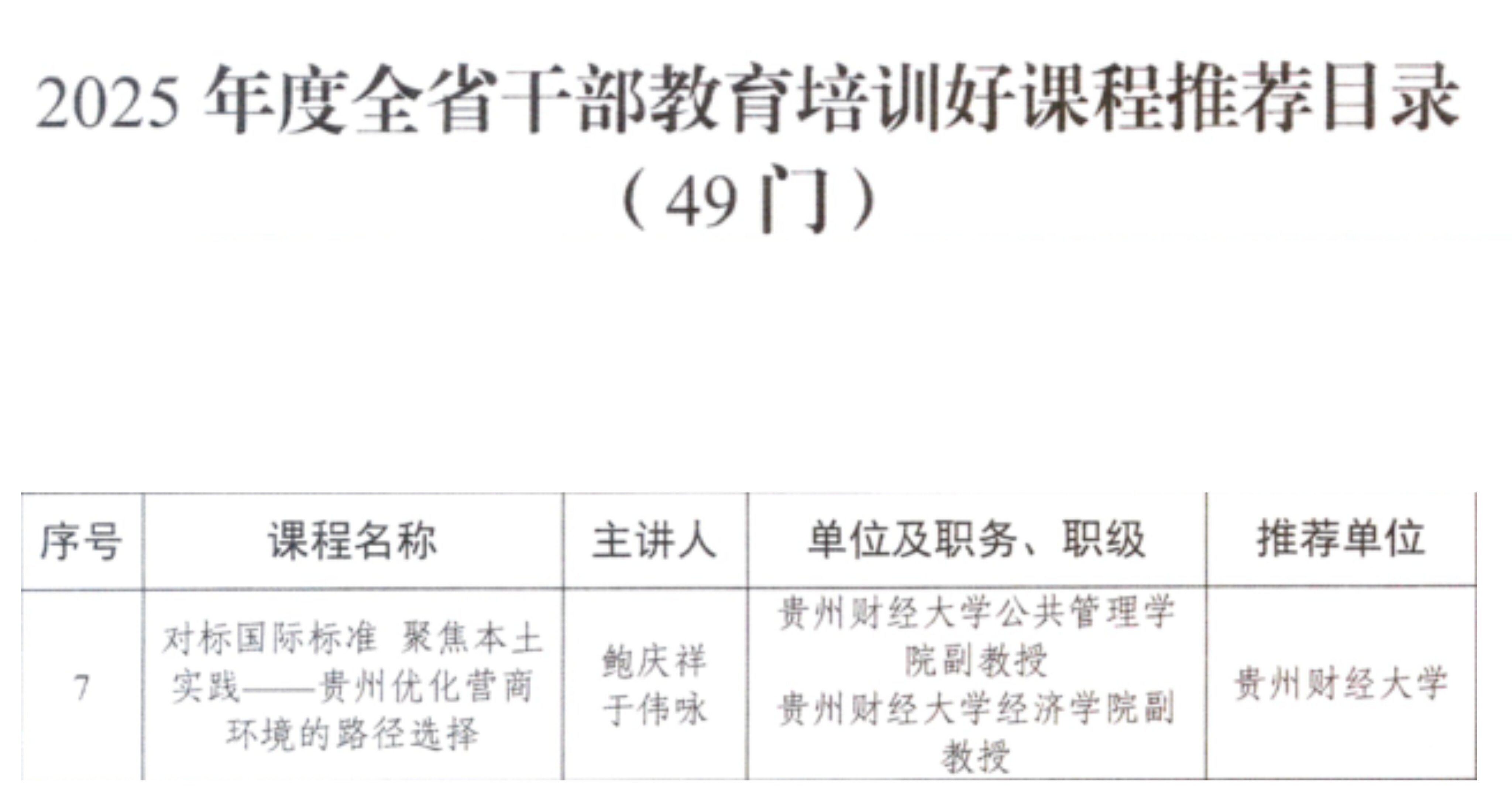 本次入选课程由鲍庆祥、于伟咏老师联合开发,课程立足贵州发展实际,紧扣优化营商环境核心主题,既对标国际先进标准,又深度结合本土实践探索,为全省干部提升专业能力、服务地方发展提供了优质教学资源。