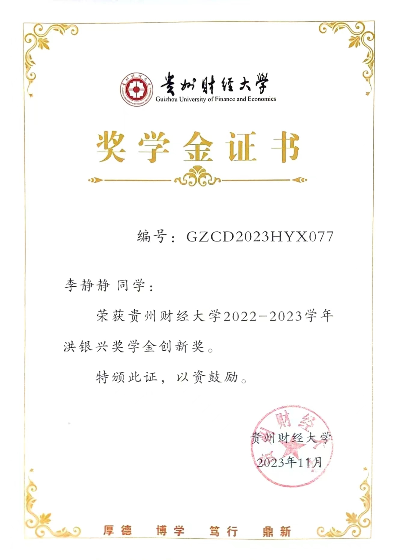 [1] 贵州财经大学2023年度“洪银兴”创新奖学金.