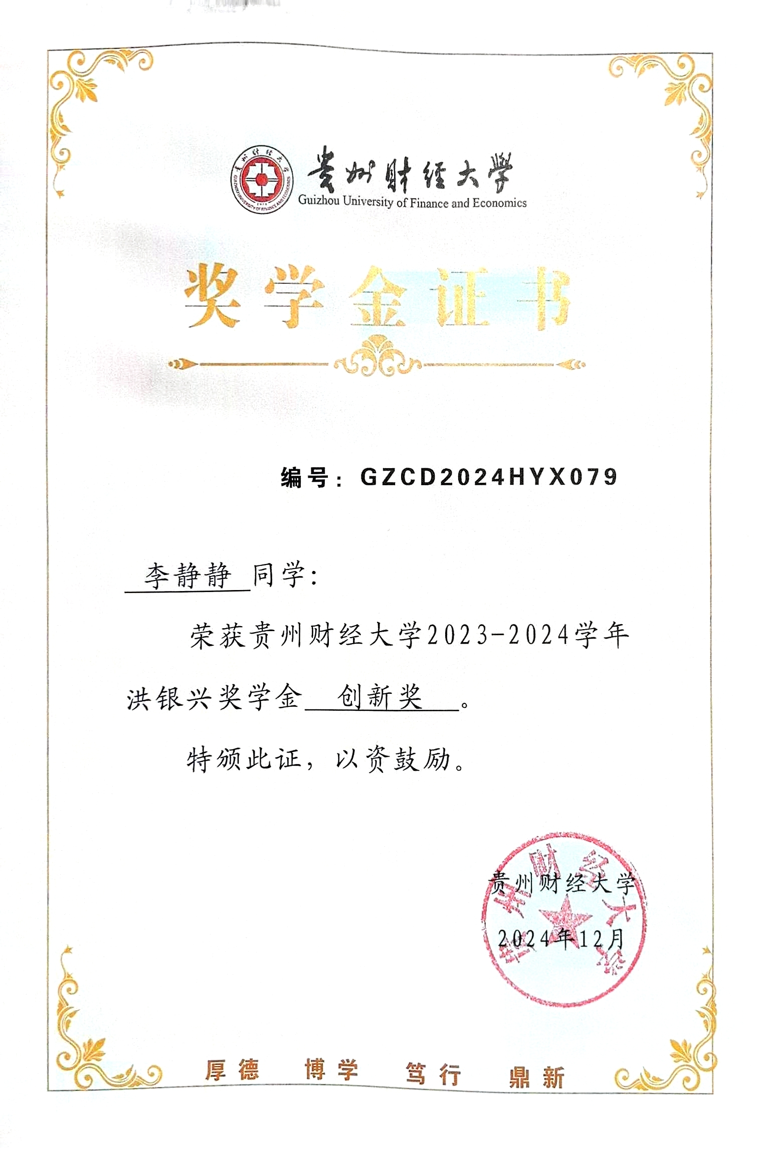 [3] 贵州财经大学2023-2024学年博士研究生一等学业奖学金.